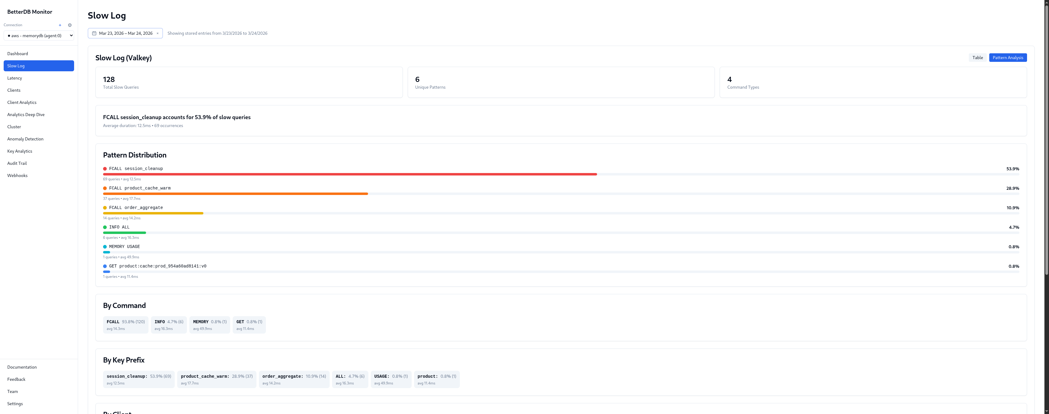 By client: 172.31.13.105:41678 - 100% of the 128 slow queries, avg 14.3ms. Every slow command in this incident came from a single IP. In a production environment that maps directly to a specific service, pod, or cron job.